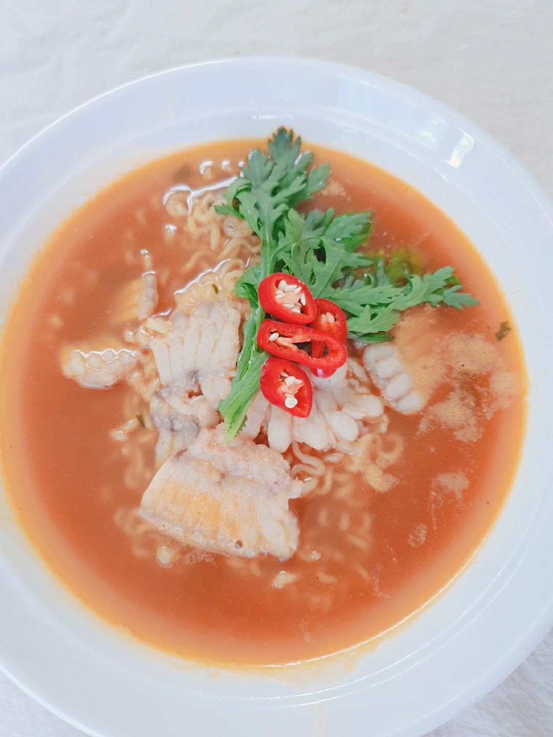 얼큰한 라면과 부드러운 홍어 살 입안을 채우는 홍어의 향이 가득 품은 국물
